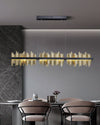 Werten Sie Ihr kulinarisches Erlebnis mit dieser atemberaubenden und modernen Leuchte auf. Der LED-Kronleuchter im Iceberg-Design vereint klare Linien mit einem Hauch von Luxus und setzt einen Blickfang in jedem Esszimmer oder auf jeder Kücheninsel. Dieser atemberaubende Kronleuchter hat unregelmäßige Ränder, die die Schönheit leuchtender Eiszapfen imitieren, und ist die perfekte Ergänzung für Räume, die lineare Beleuchtung benötigen. Der schwarze Eisenkörper des Arbeitszimmers kontrastiert mit polierten Edelstahlstäben, und der moderne Kontrast ist genau richtig.